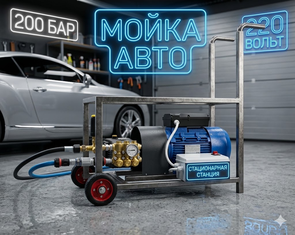Специализированный стационарный аппарат высокого давления, спроектированный для работы от стандартной однофазной бытовой сети 220 Вольт. Сборка (🇷🇺 Россия + 🇨🇳 Китай) является предельным максимумом того, что можно выжать из домашней розетки без отключения автоматов. В основе лежит однофазный двигатель Элком (3 кВт) и плунжерная помпа Annovi Reverberi 11.20 (11 л/мин). Комплект установлен на стационарную раму и усилен грязевой турбофрезой. Аппарат решает задачи, непосильные бытовым пластиковым мойкам: отмывка фасадов, крыш, бетонных дорожек, а также личных грузовиков и тракторов на территории частного дома или небольшой базы.