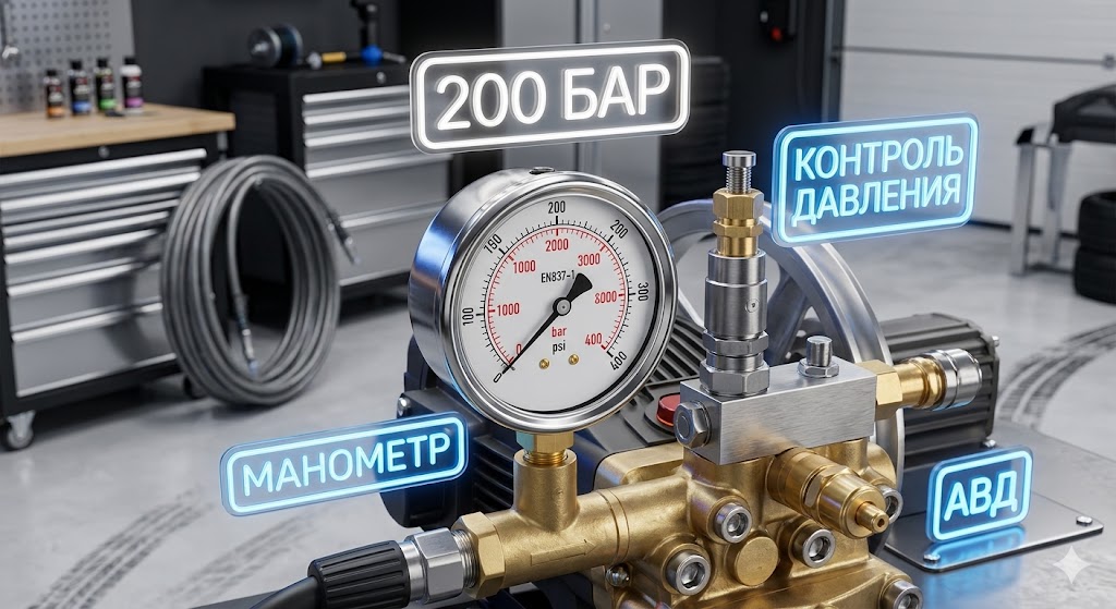 Помпа AR 11.20 способна выдавать 200 бар, но в связке с мотором 220В её рабочий максимум ограничен. Регулятор VRT3 на 160 бар (с функцией легкого старта) установлен намеренно, чтобы сбалансировать нагрузку на однофазную сеть и защитить двигатель от критических перегрузок.