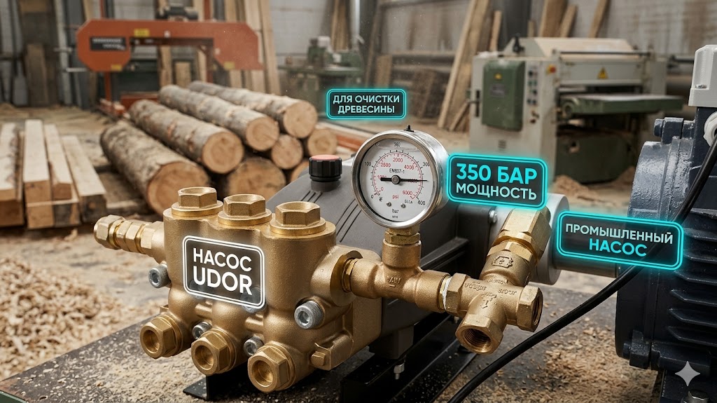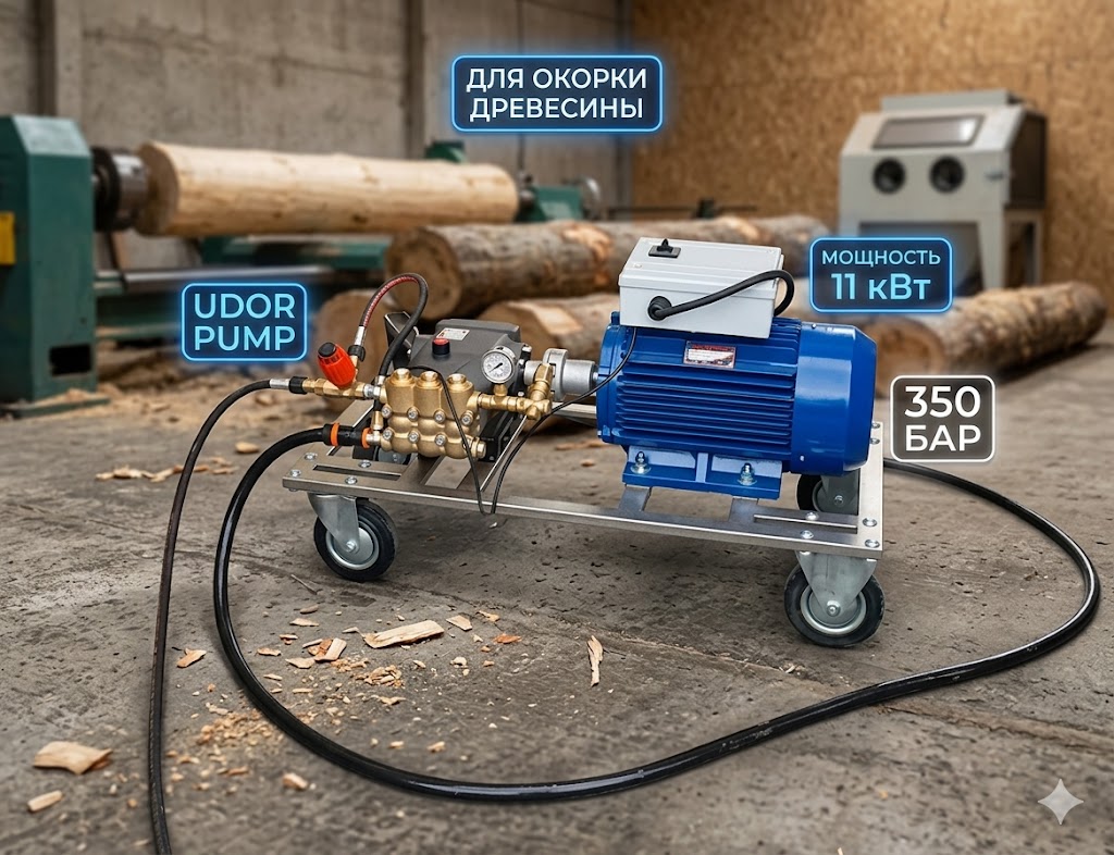 Кирилл, 250bar.ru: “Это тяжелая гидравлическая артиллерия. Часто клиенты берут 250 бар для окорки зимнего леса, а потом жалуются, что дело идет медленно. Для плотной коры нужна кинетическая энергия, которую дает только аппарат высокого давления 350 бар. Мы поставили сюда итальянскую помпу UDOR — это монолитная латунь, которая терпит зверские нагрузки, и скрутили ее с 11-киловаттным движком. Важный момент: для такой мощности нужна безупречная линия 380В и автомат минимум на 32 Ампера, иначе при пуске будет выбивать пробки. Обвязку сделали топовую: итальянский регулятор, пистолет SG04 с вращением (чтобы кисть не выкручивало от отдачи) и катушка, чтобы шланг не болтался в опилках.”Опыт эксплуатации на производствах