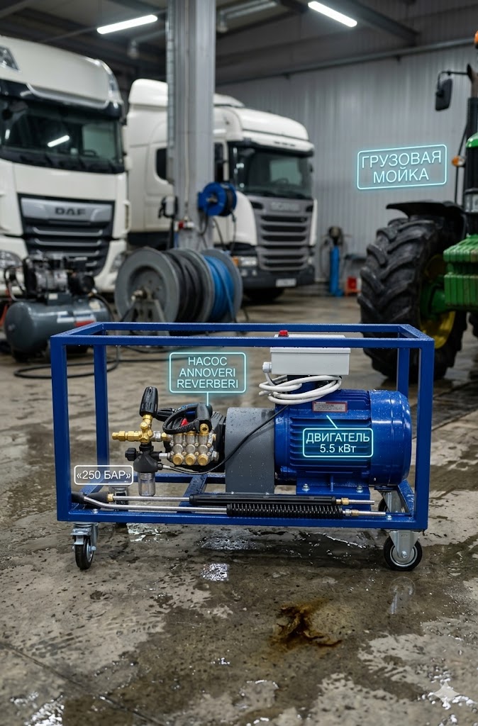 Надежный аппарат высокого давления 250 бар для грузовой мойки, автобаз и сельскохозяйственных предприятий. Эта стационарная гидравлическая сборка представляет собой идеальный баланс мощности и цены для коммерческого использования. На усиленную стальную раму установлен выносливый отечественный 🇷🇺 Мотор Уралэлектро 5.5 кВт (380В) и премиальная 🇮🇹 Помпа Annovi Reverberi (Италия). Комплектация продумана специально для обслуживания длинномеров: 30 метров шланга позволяют мойщику обойти фуру с полуприцепом целиком без перетаскивания аппарата. Для борьбы со сложными загрязнениями в набор включены ротационная турбофреза и гидропескоструйная насадка.