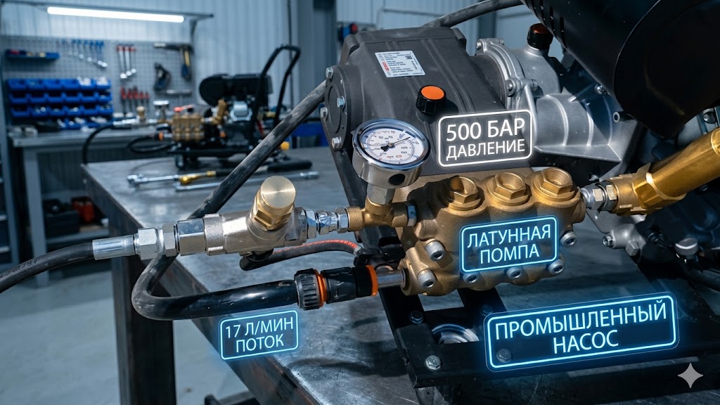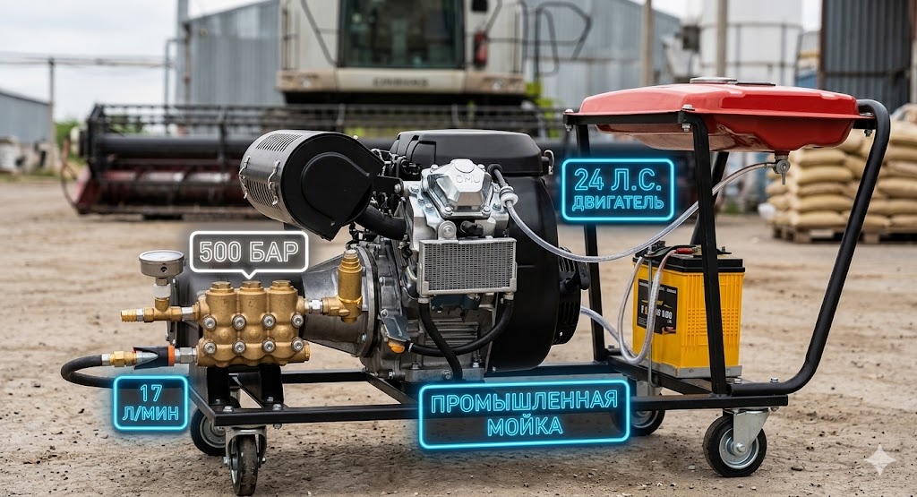 Индустриальный бензиновый аппарат высокого давления 500 бар, созданный для решения задач, где обычная вода бессильна. Это оборудование класса «гидродемонтаж», спроектированное для крупных сельскохозяйственных предприятий, мостоотрядов и служб прочистки магистральной канализации. Сборка (🇨🇳 Китай + 🇮🇹 Италия) приводится в действие массивным двухцилиндровым двигателем Zongshen GB680FE (24 л.с.) с электростартером. Мотор через редуктор крутит высоконапорную помпу, выдающую 500 бар при потоке 17 л/мин. Аппарат комплектуется 50-метровым армированным рукавом на 600 бар, усиленным пистолетом и ротационной фрезой TPR600.