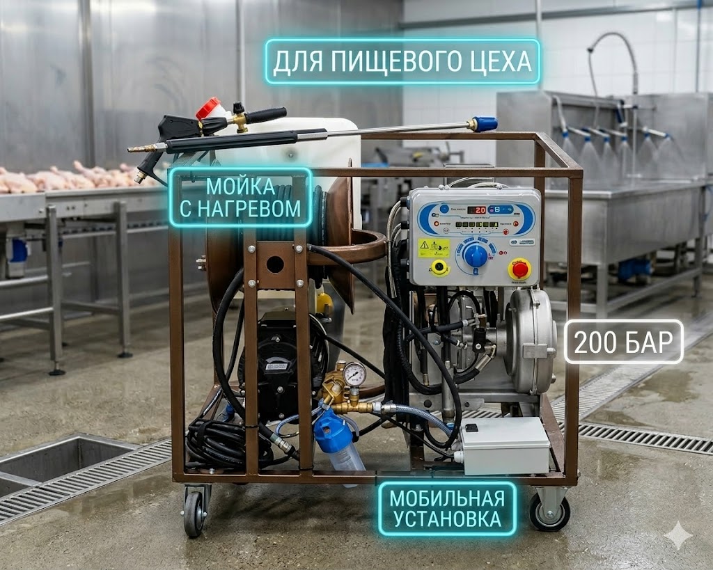 Индустриальный аппарат высокого давления с подогревом воды, спроектированный специально для нужд пищевой промышленности, мясокомбинатов и рыбных коптилен. Эта профессиональная мойка высокого давления с подогревом воды (сборка 🇮🇹 Италия + 🇷🇺 Россия) смонтирована на мобильной четырехколесной раме для удобного перемещения по мокрым цехам. Основа агрегата — легендарный плунжерный насос Hawk (200 бар), соединенный с выносливым российским электродвигателем Уралэлектро. Главное оружие в борьбе с животными жирами — встроенный итальянский бойлер, способный мгновенно нагревать водяной поток до 90-100°C. Установка полностью укомплектована итальянскими аксессуарами, включая систему Total Stop, катушку и 30-метровый рукав.