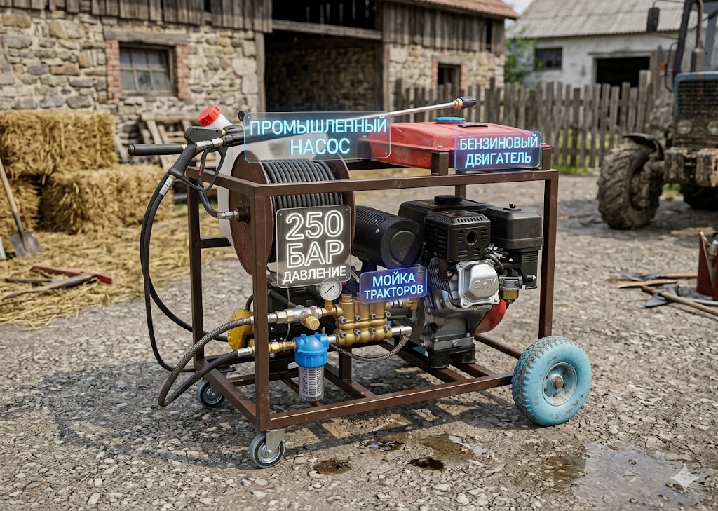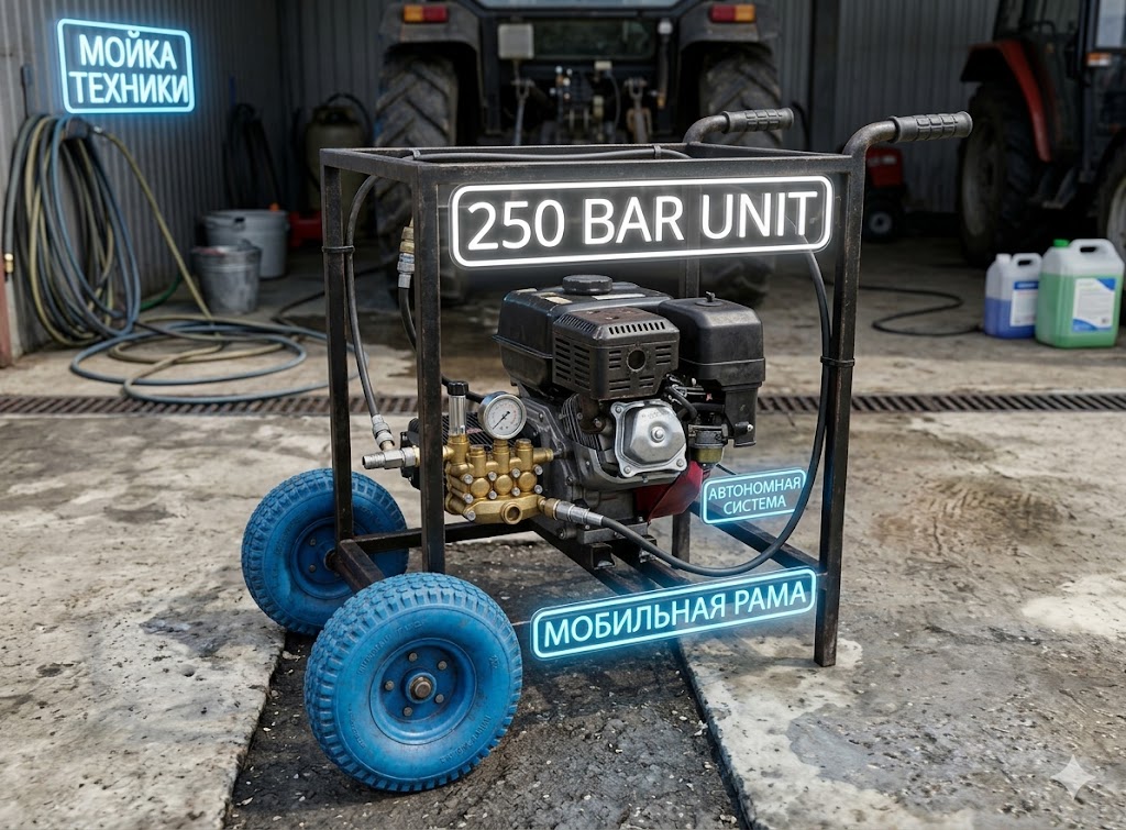 Кирилл, технический специалист 250bar.ru: “Когда агрофирмы ищут бензиновую мойку для спецтехники, они часто забывают про эргономику. Мыть комбайн аппаратом, у которого шланг 10 метров — это ад, вам придется постоянно таскать за собой тяжелую раму по грязи. В этой сборке мы заложили итальянский РВД на 20 метров. Бензиновый АВД стоит в кузове пикапа или рядом с еврокубом, а вы спокойно обходите трактор со всех сторон. Мощности в 15 л.с. хватает за глаза, чтобы помпа не захлебывалась под давлением 250 бар.”Отзывы: Бензиновая мойка в реальных условиях