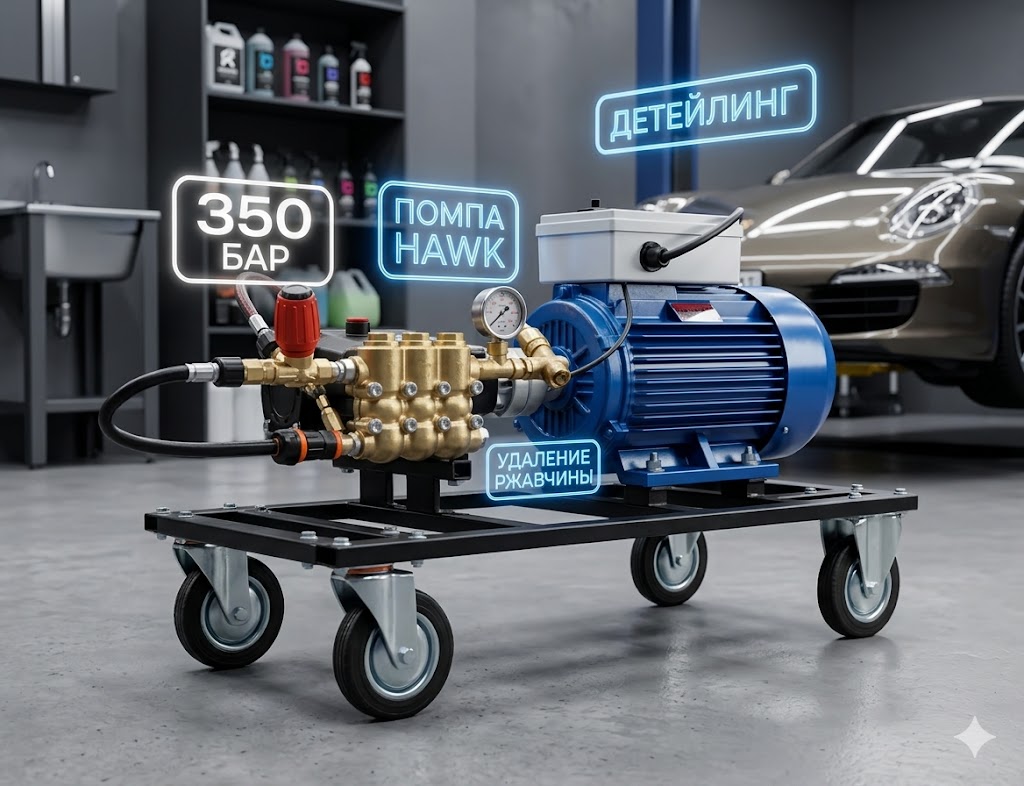 Специфическая сборка сверхвысокого давления (350 бар), спроектированная на базе итальянского плунжерного насоса Hawk. Аппарат собран под строгие задачи детейлинг-студий и реставрационных мастерских: глубокая детализация ходовой части, вымывание многолетних отложений из скрытых полостей рамы, снятие пластовой ржавчины и подготовка днища к антикоррозийной обработке. Это не классическая автомойка, а гидродинамический инструмент (требуется сеть 380В).