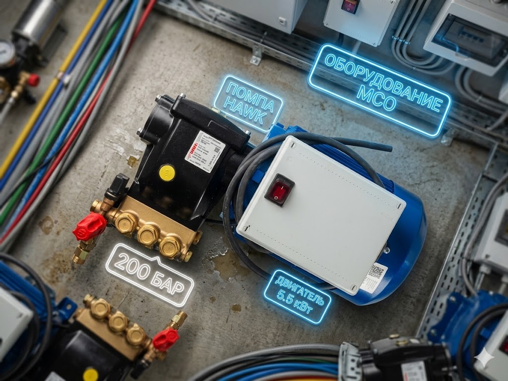 - Плунжерный насос Hawk NMT 1520 (200 бар, 15 л/мин) — самая популярная и ремонтопригодная помпа для МСО в России.