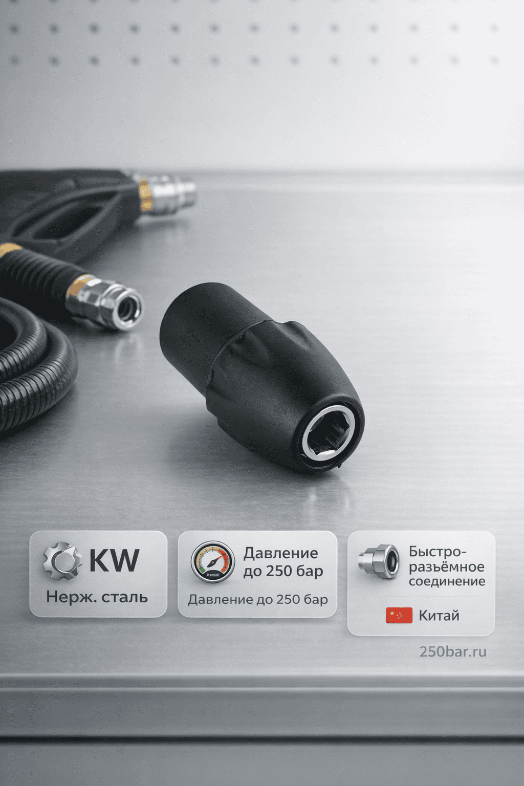 Совместим со стандартом KW и используется как полноценный аналог соединений R+M (Германия). Позволяет быстро менять пистолеты, копья, шланги и насадки без резьбового закручивания, снижая износ соединений и ускоряя работу оператора.