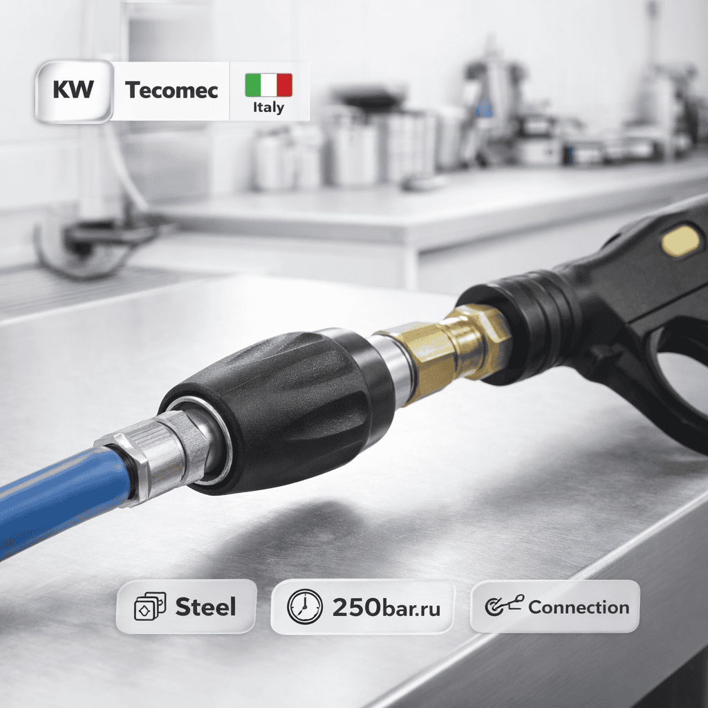 Профессиональный быстросъём KW Tecomec из нержавеющей стали для быстрого и надёжного подключения аксессуаров в системах мойки высокого давления.