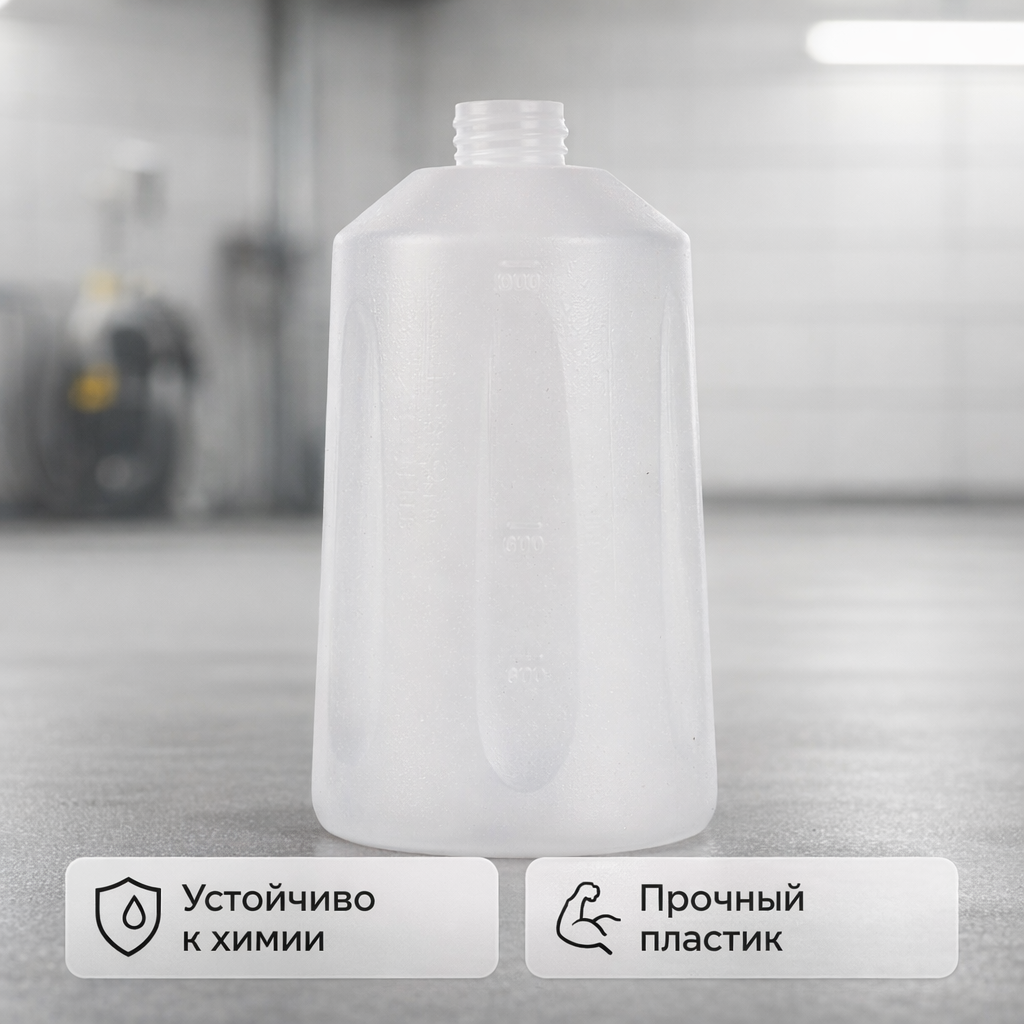 Объём 1 литр оптимален для стабильной работы без частых дозаправок. Прочный пластик устойчив к воздействию автохимии и механическим нагрузкам, что делает бутылку удобной для ежедневной эксплуатации на автомойках и в детейлинг‑центрах.