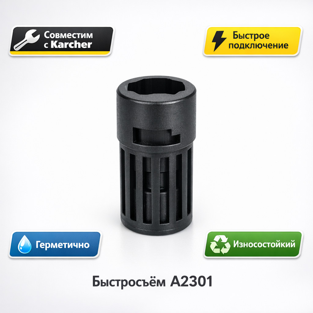 Быстросъём A2301 предназначен для быстрого и надёжного подключения шлангов и аксессуаров к бытовым мойкам Karcher. Обеспечивает герметичное соединение, удобство эксплуатации и экономию времени при работе.