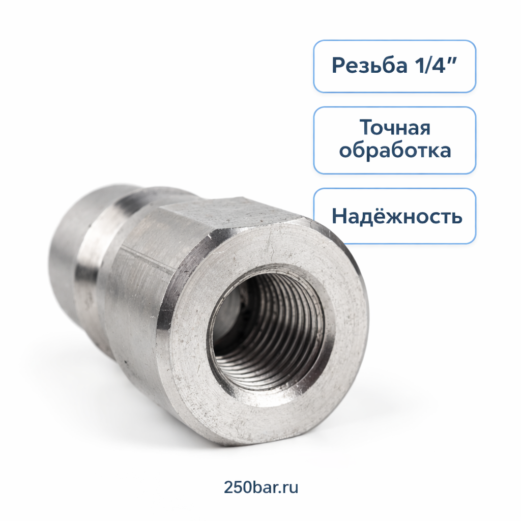 Внутренняя резьба 1/4″ (F) обеспечивает универсальную совместимость с большинством аксессуаров АВД. Ниппель позволяет быстро менять оборудование без использования инструмента, снижая время простоя и износ резьбовых соединений.
