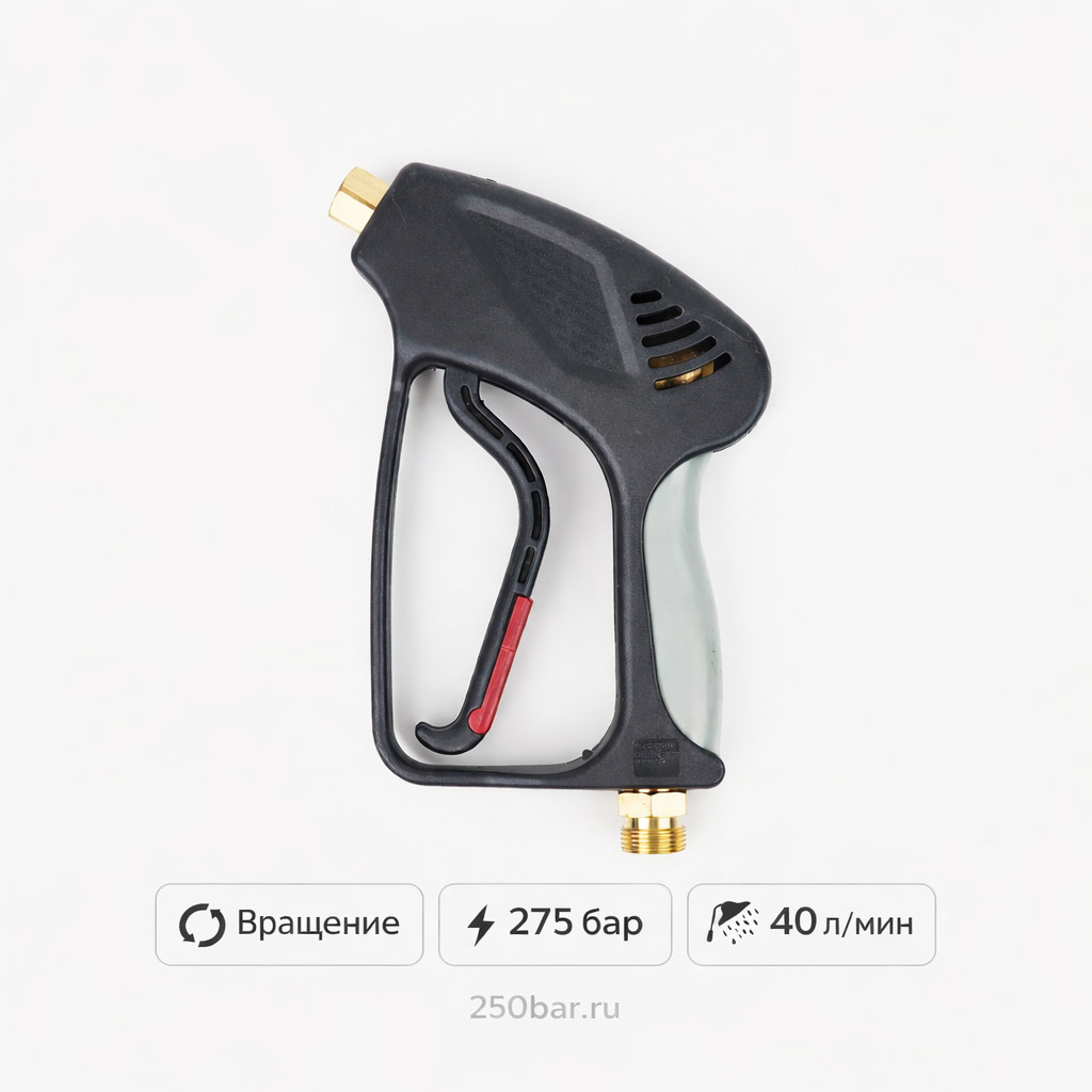Модель рассчитана на рабочее давление до 275 бар и высокую пропускную способность — до 40 л/мин, что позволяет использовать пистолет в интенсивном режиме.
