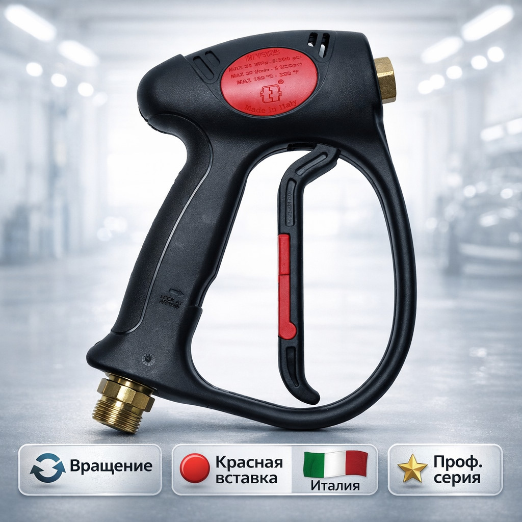 Профессиональный пистолет высокого давления MV925 с муфтой вращения от Tecomec (Италия). Красная вставка облегчает визуальную идентификацию на посту, а вращающаяся муфта предотвращает перекручивание шланга и повышает комфорт работы.