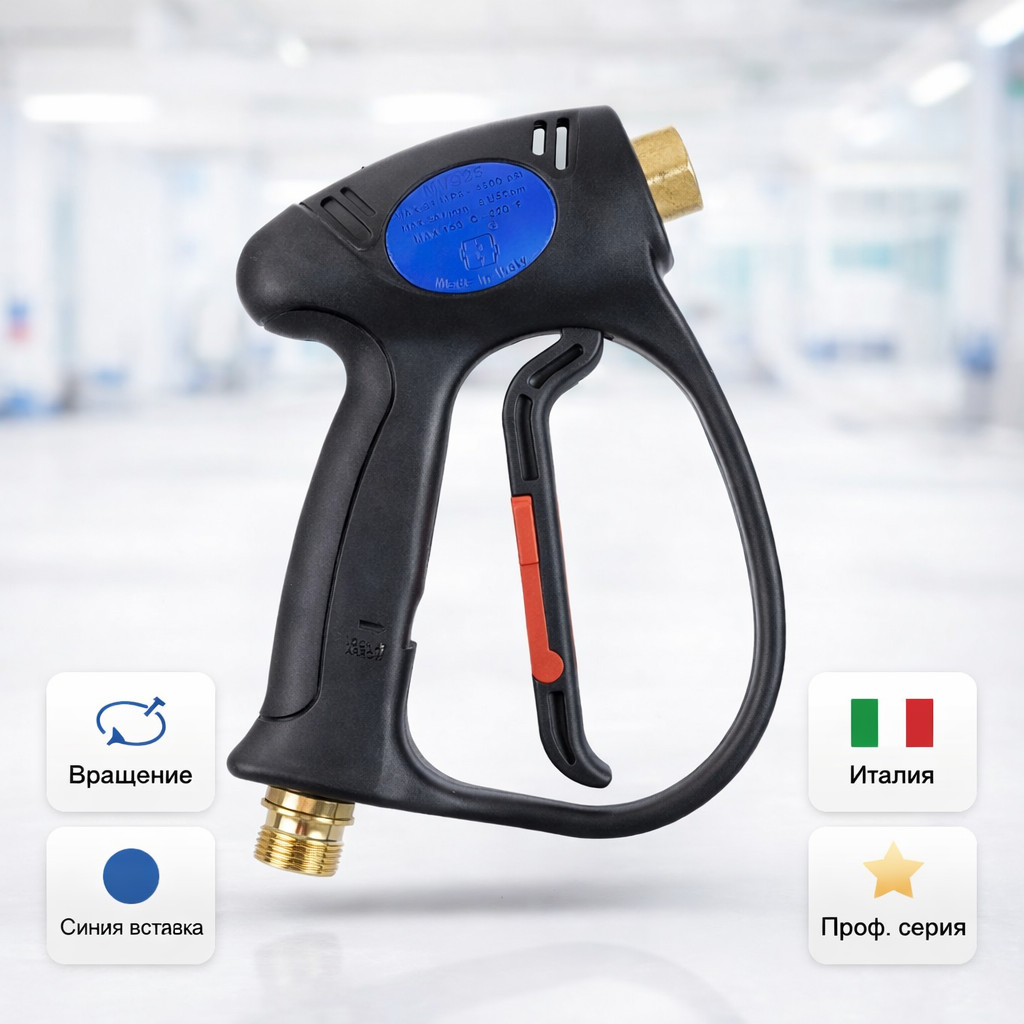 Профессиональный пистолет высокого давления MV925 с муфтой вращения от Tecomec (Италия). Синяя вставка облегчает визуальную идентификацию на посту, а вращающаяся муфта предотвращает перекручивание шланга и повышает комфорт работы оператора.