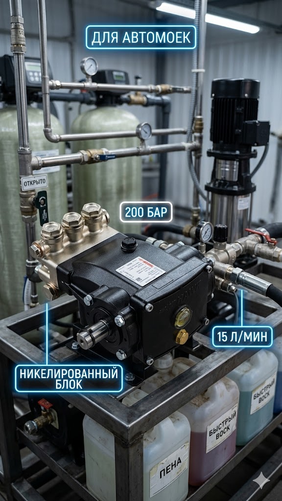 Плунжерный насос Hawk CRW 1520 разработан для интенсивной эксплуатации на автомойках самообслуживания. Никелированный головной блок и усиленные водяные сальники обеспечивают повышенную стойкость к износу и стабильную работу при 200 бар.