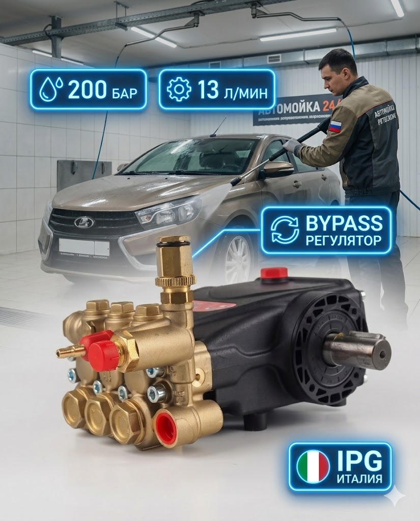🔧💧 Плунжерный насос IPG E2D2013 с регулятором bypass (200 бар, 13 л/мин)