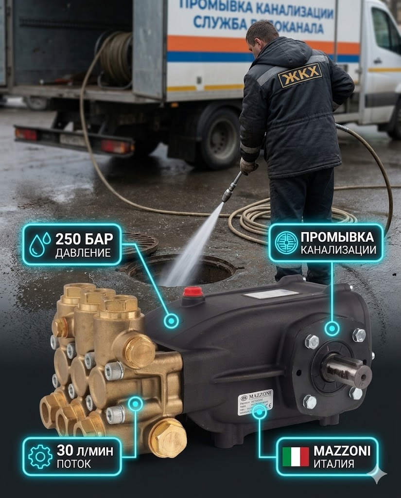 Насос Mazzoni GM 30250BR применяется в профессиональном оборудовании для гидродинамической очистки труб, промывки канализации и других промышленных процессов, где требуется высокий расход воды и стабильное давление.