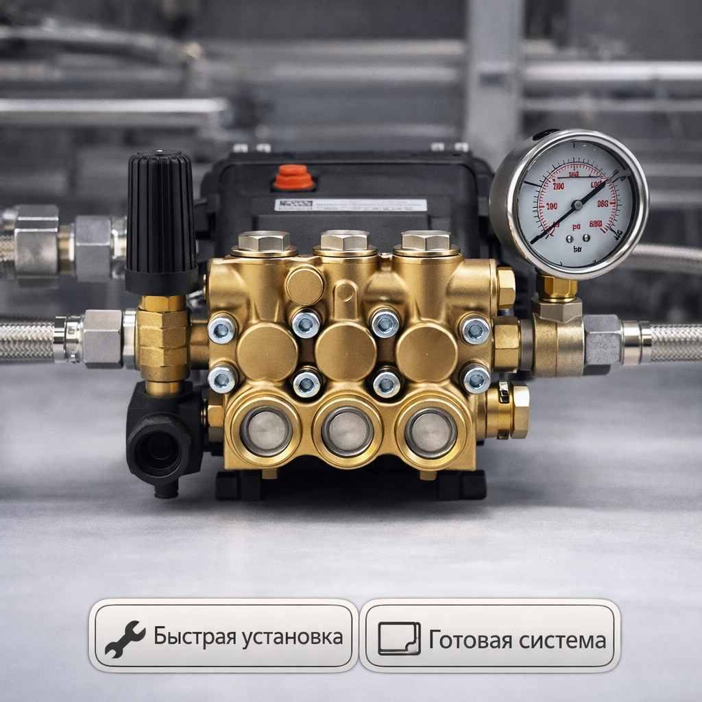Плунжерный насос TOR 15.25 в сборе — готовое решение для систем высокого давления. Оснащён регулятором давления bypass и манометром, обеспечивает стабильную работу при давлении до 250 бар и производительности 15 л/мин.