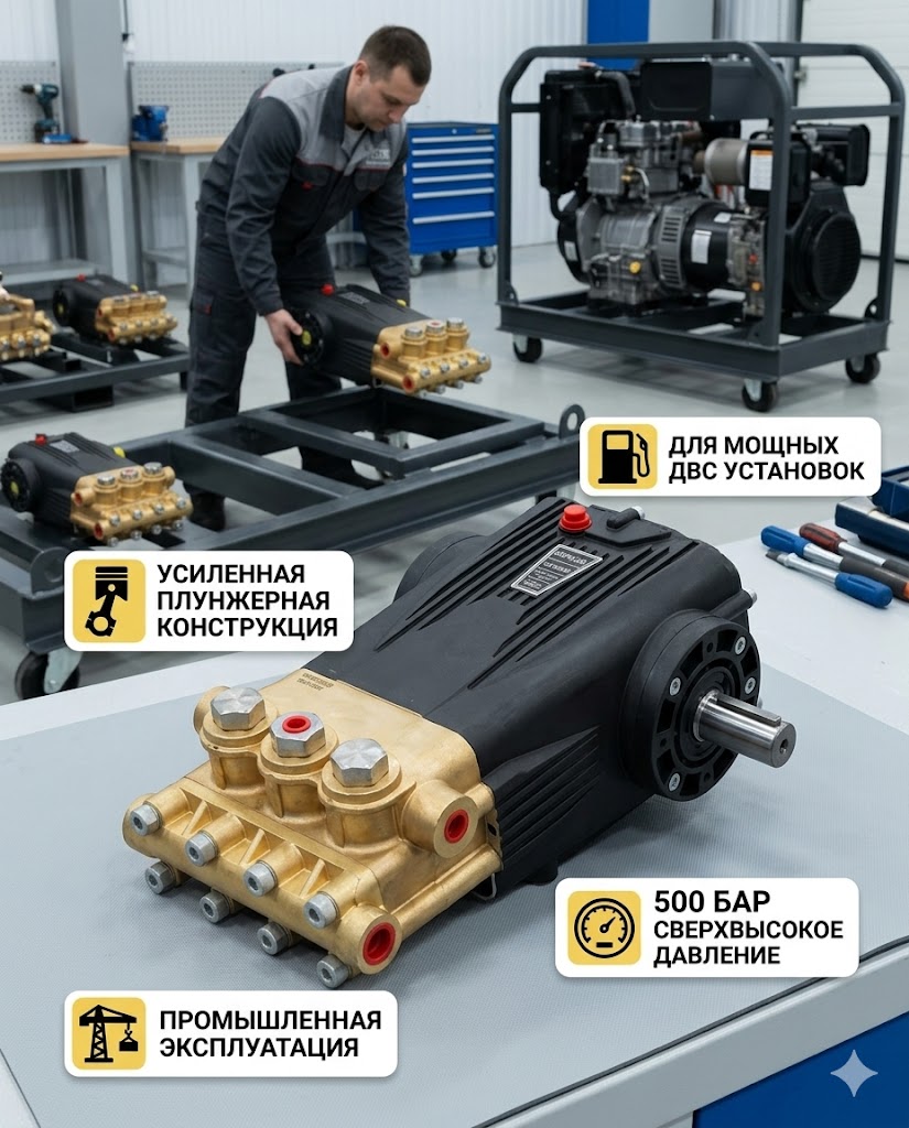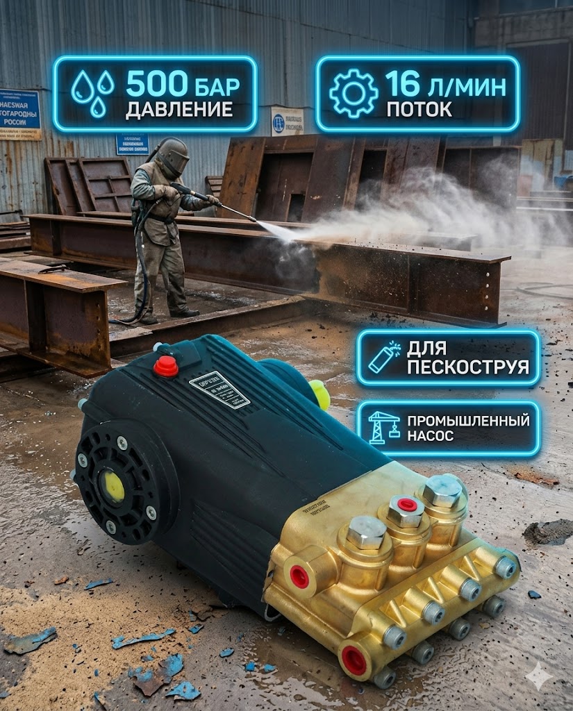 Модель сочетает высокое давление 500 бар и стабильную подачу 16 л/мин, что делает её оптимальным решением для профессионального применения.