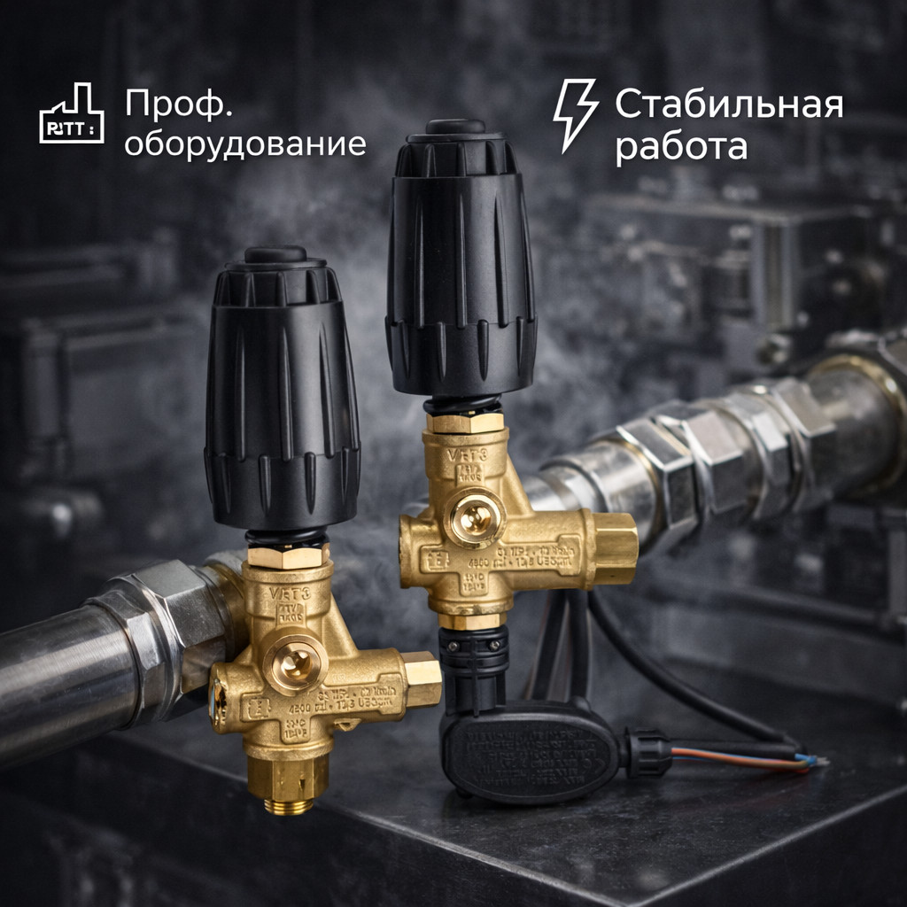 Mecline VRT3 — профессиональный регулятор давления с режимами Bypass и Total Stop, рассчитанный на работу до 310 бар при высоком расходе до 40 л/мин. Используется в интенсивных моечных и промышленных установках.