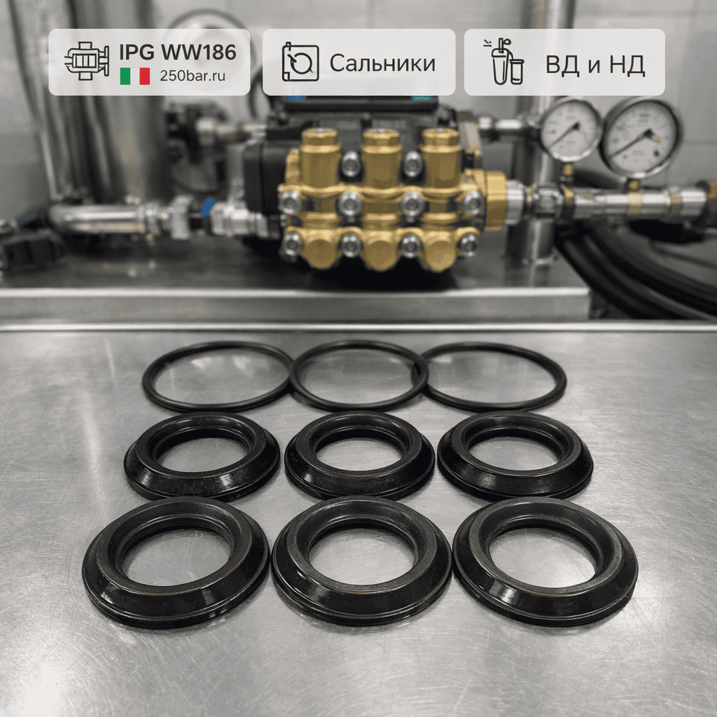 Комплект водяных сальников высокого и низкого давления для насоса IPG WW186. Используется для устранения протечек и восстановления стабильного давления в системах высокого давления.