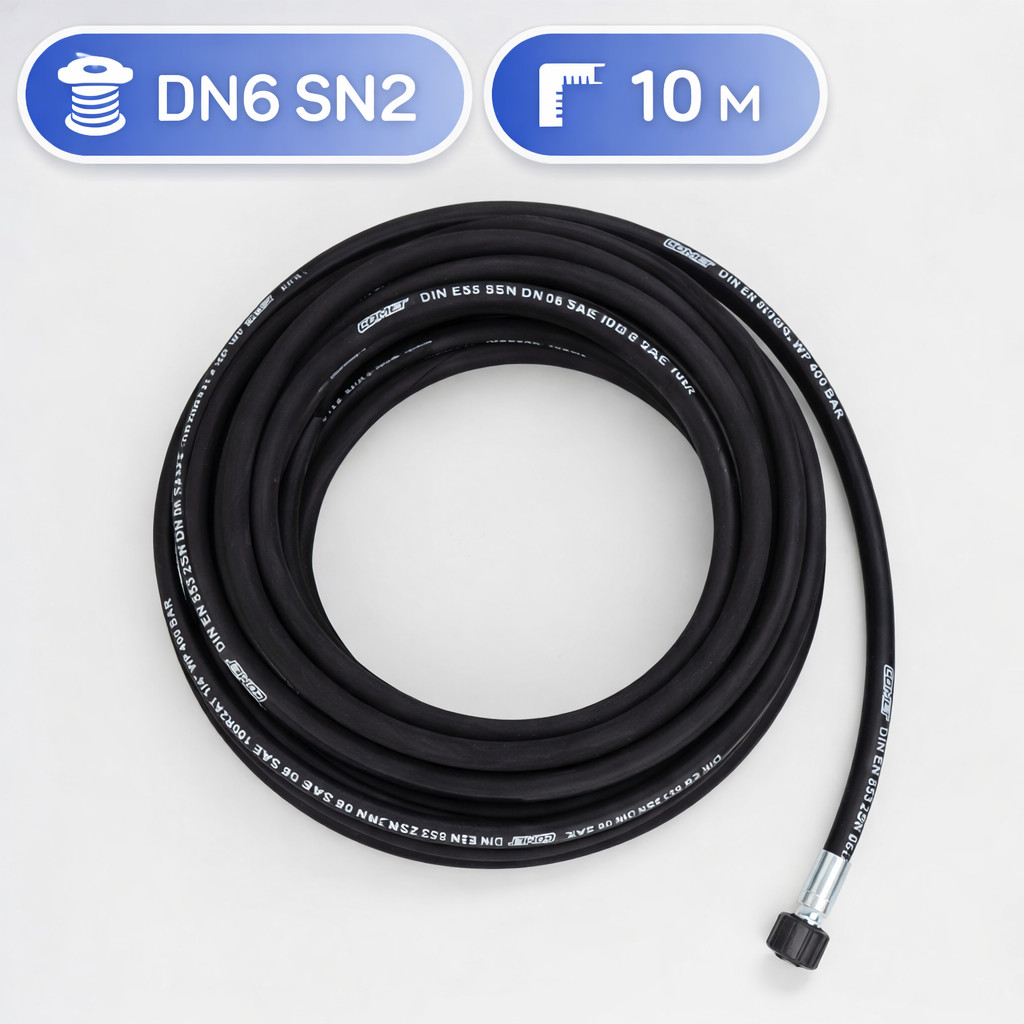 Готовый РВД DN6 SN2, 10 м, Г‑Г предназначен для подключения моечного, клинингового и промышленного оборудования без необходимости дополнительной сборки. Шланг изготовлен по стандарту SN2, что обеспечивает устойчивость к высоким нагрузкам и стабильную работу при интенсивной эксплуатации.