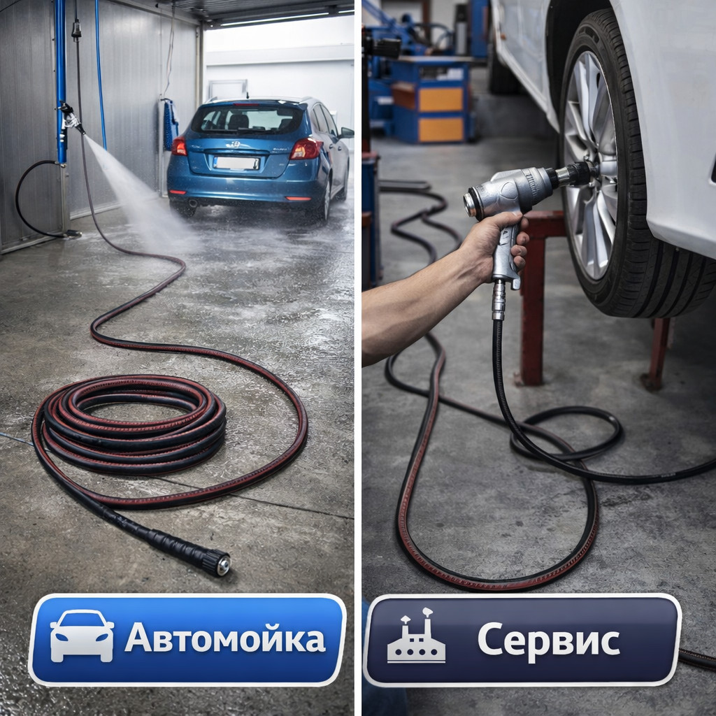 Соединение гайка‑гайка является универсальным и подходит для большинства систем высокого давления. Длина 15 метров обеспечивает увеличенный рабочий радиус и удобство при обслуживании автомоек и сервисных зон.