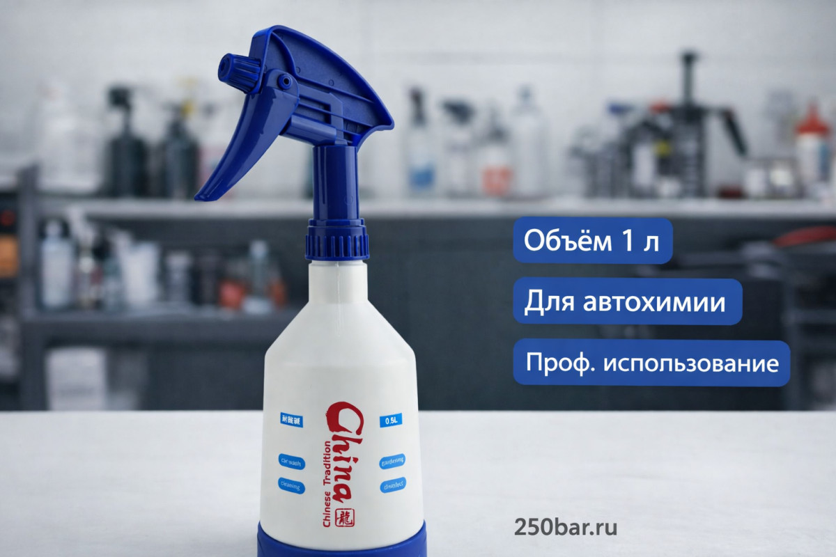 Профессиональный триггер‑распылитель объёмом 1 литр для нанесения автохимии, очистителей и моющих растворов при мойке и детейлинге.
