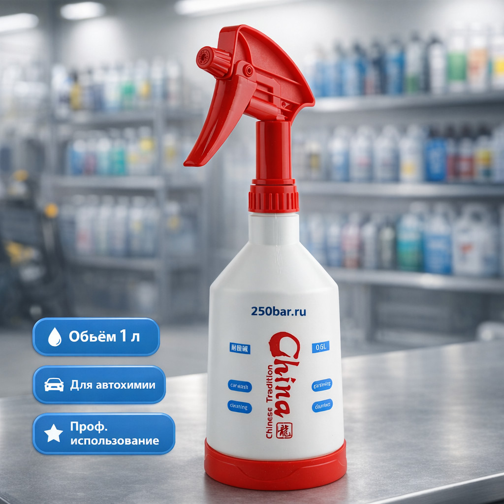 Профессиональный триггер‑распылитель объёмом 1 литр для нанесения автохимии, очистителей и моющих составов при мойке и детейлинге.