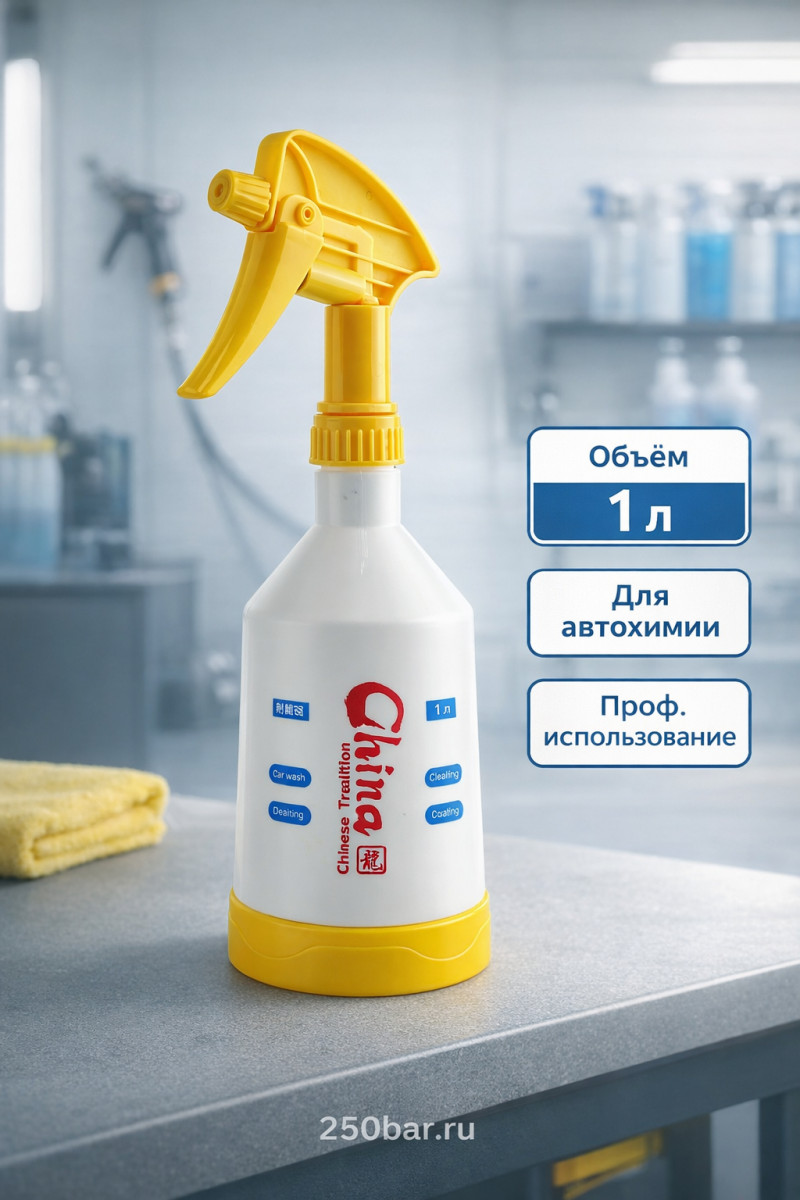 Профессиональный триггер‑распылитель объёмом 1 литр для нанесения автохимии, очистителей и моющих растворов при мойке и детейлинге.
